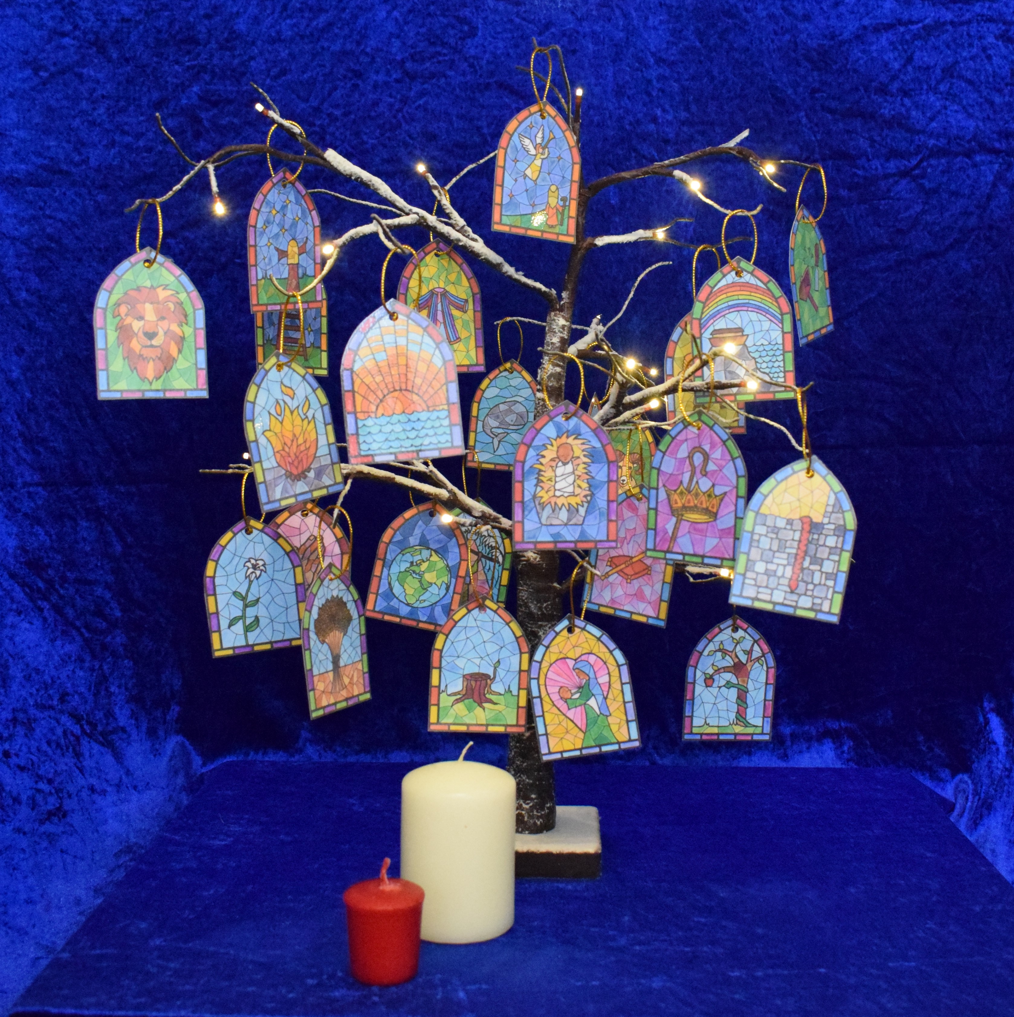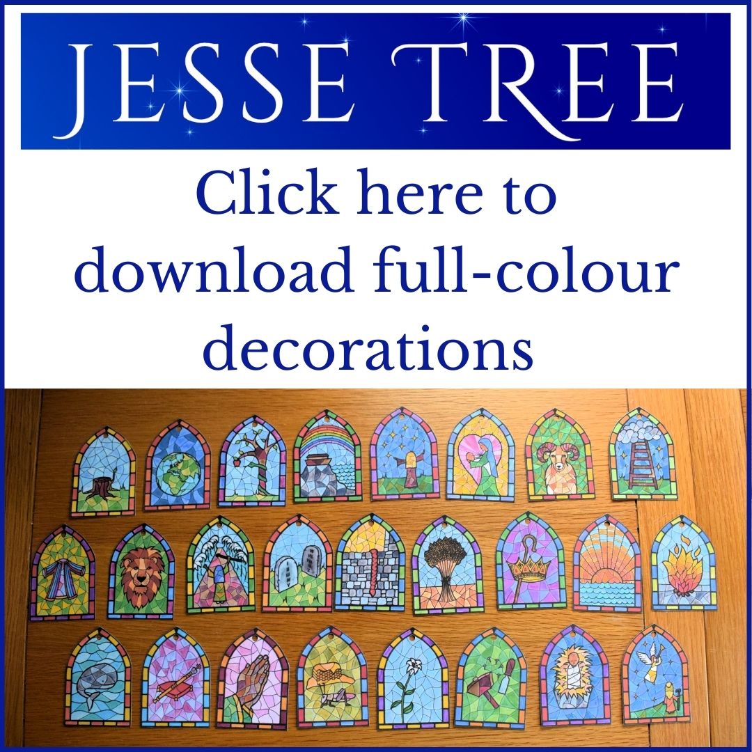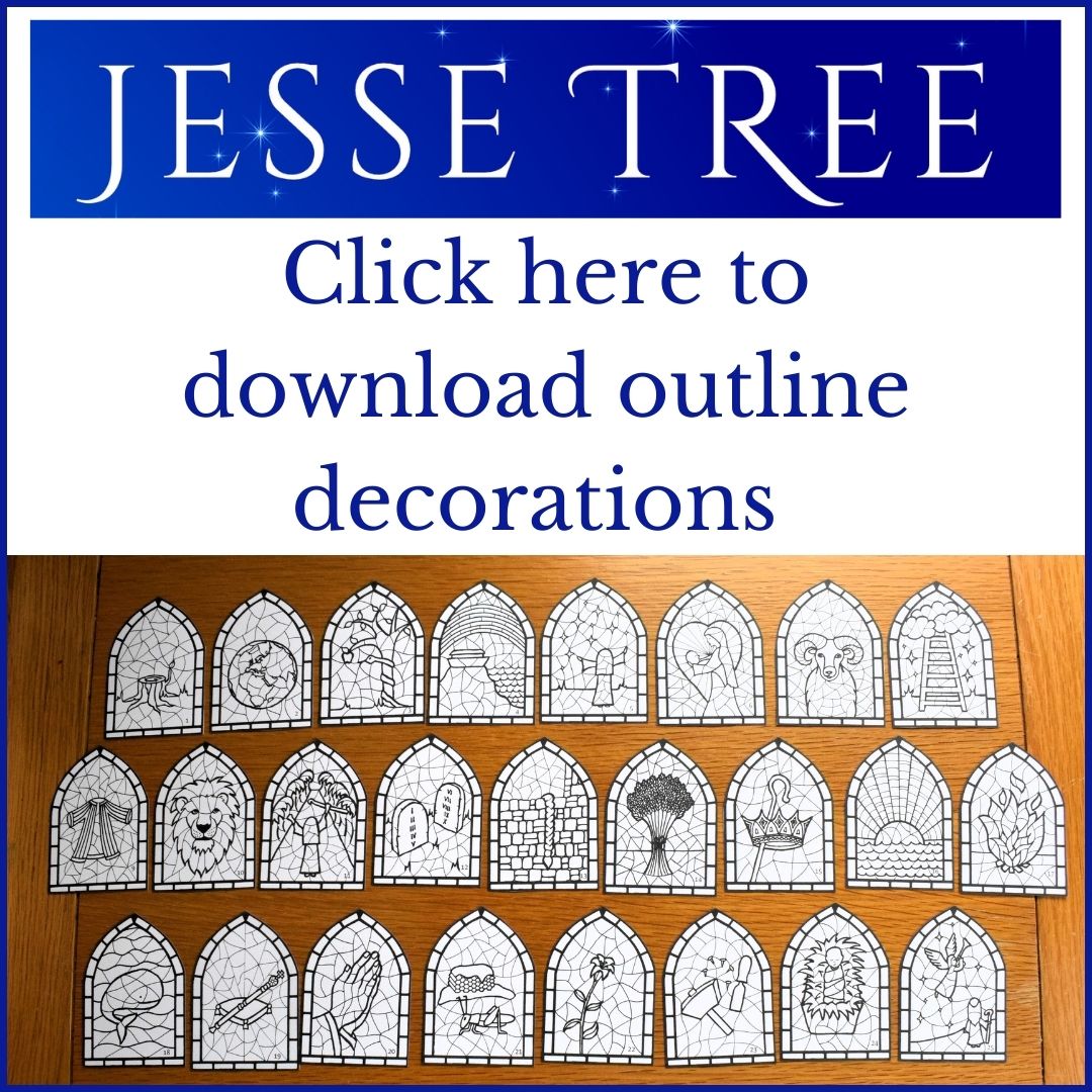 If you are here because you don’t want to spoil your lovely book by cutting out the illustrations, I completely understand! The downloads below are free for your personal use*. Click on either of the boxes below to download the PDF of your choice – either to print the outlines to colour in yourself, or print them ready-coloured. Then simply cut them out, attach string to hang on your own Jesse Tree… and enjoy!